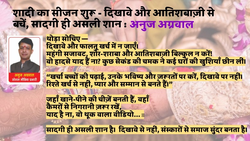 शादी का सीजन शुरू हो रहा है। घरों में खुशियों की तैयारियाँ जोरों पर हैं। लेकिन इसी बीच विश्व हिन्दू महासंघ (गाजि०) के जिला सो० मी० प्रभारी अनुज अग्रवाल (रामानुज) ने लोगों से एक महत्वपूर्ण अपील की है –