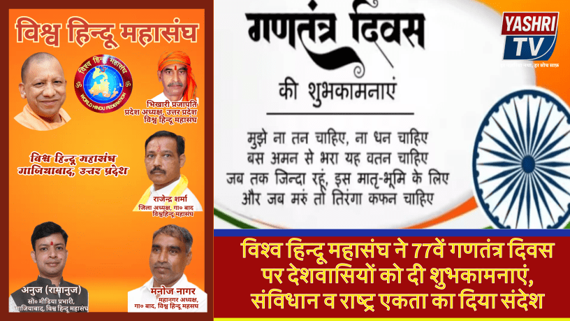 77वें गणतंत्र दिवस के अवसर पर विश्व हिन्दू महासंघ, गाजियाबाद–मेरठ मण्डल, उत्तर प्रदेश की ओर से देशवासियों को हार्दिक शुभकामनाएं दी गईं।