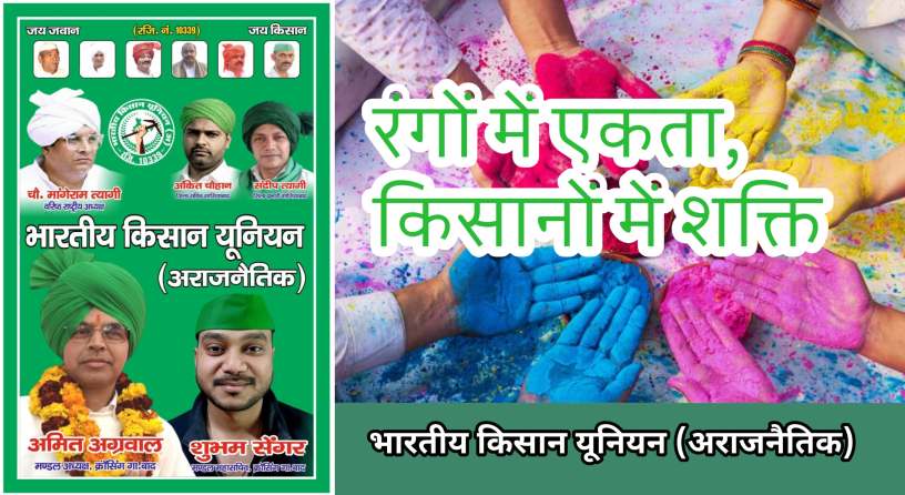 गाज़ियाबाद। भारतीय किसान यूनियन (अराजनैतिक) के जिला प्रभारी संदीप त्यागी एवं मंडल अध्यक्ष अमित अग्रवाल ने समस्त क्षेत्रवासियों, किसानों, मजदूरों, युवाओं एवं आम नागरिकों को होली की हार्दिक शुभकामनाएँ दीं।