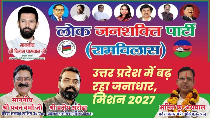 लोक जनशक्ति पार्टी (रामविलास) के प्रदेश प्रचार मंत्री (पश्चिम उत्तर प्रदेश) अमित कुमार अग्रवाल ने कहा कि आगामी 2027 उत्तर प्रदेश विधानसभा चुनाव को लेकर पार्टी पूरी मजबूती और रणनीति के साथ काम कर रही है। उन्होंने बताया कि प्रदेश अध्यक्ष (पश्चिम उत्तर प्रदेश) पवन वर्मा जी के नेतृत्व में संगठन लगातार मजबूत किया जा रहा है और कार्यकर्ता बूथ स्तर तक सक्रिय होकर जनसंपर्क अभियान चला रहे हैं।