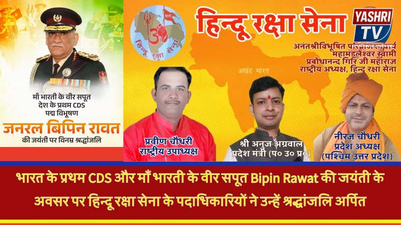 भारत के प्रथम CDS और माँ भारती के वीर सपूत Bipin Rawat की जयंती के अवसर पर हिन्दू रक्षा सेना के पदाधिकारियों ने उन्हें श्रद्धांजलि अर्पित की और उनके राष्ट्रसेवा के योगदान को याद किया।